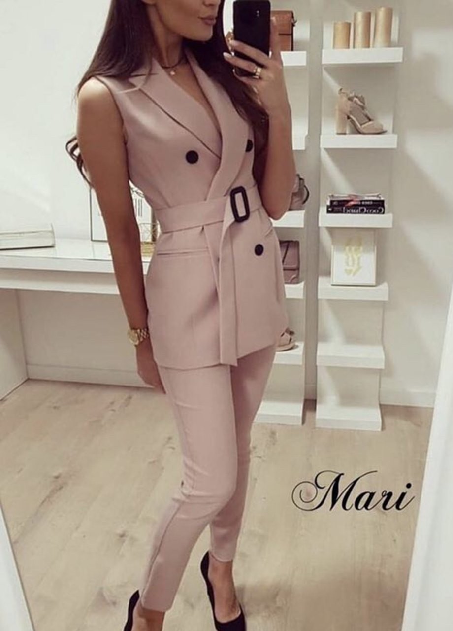 Горна част - сако: деколте: с ревери, колан с тока, ръкави: няма