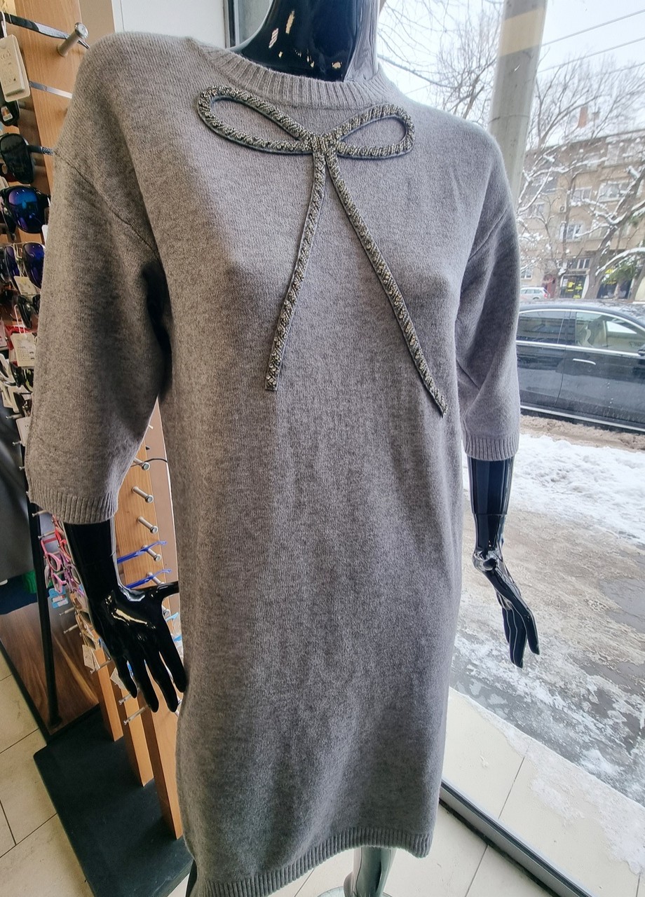 - Тази рокля представлява елегантно и уютно съчетание от плетена материя, класически сив цвят и бляскав декоративен акцент. Тя е идеална за есенно-зимния сезон, съчетавайки комфорта на плетивото с изискан и женствен завършек.